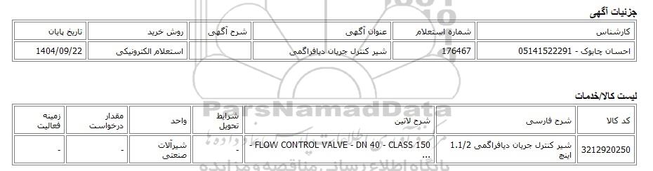 احسان چابوک - 05141522291176467شیر کنترل جریان دیافراگمیاستعلام الکترونیکی1404/09/22
