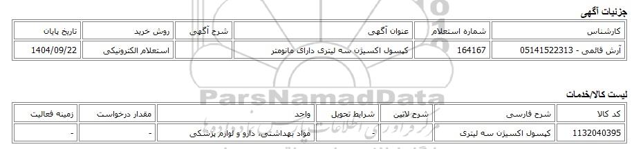 | آرش قائمی - 05141522313 | 164167 | کپسول اکسیژن سه لیتری دارای مانومتر | استعلام الکترونیکی | 1404/09/22 |