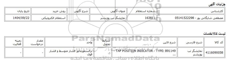 | مصطفی شایگانی پور - 05141522298 | 163811 | نمایشگر تب پوزیشنر | استعلام الکترونیکی | 1404/09/22 |