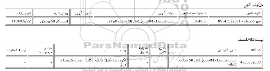 مهران دیوان - 05141522301164950بست کمربندی (فاشت) کابل 50 سانت تایوانیاستعلام الکترونیکی1404/09/22