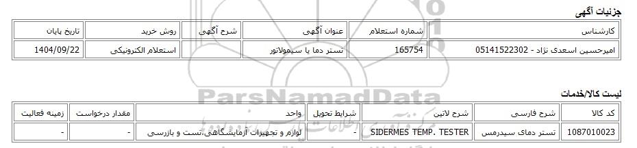 | امیرحسین اسعدی نژاد - 05141522302 | 165754 | تستر دما یا سیمولاتور | استعلام الکترونیکی | 1404/09/22 |