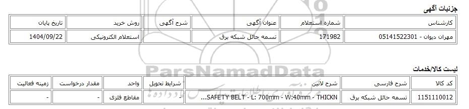 | مهران دیوان - 05141522301 | 171982 | تسمه حائل شبکه برق | استعلام الکترونیکی | 1404/09/22 |