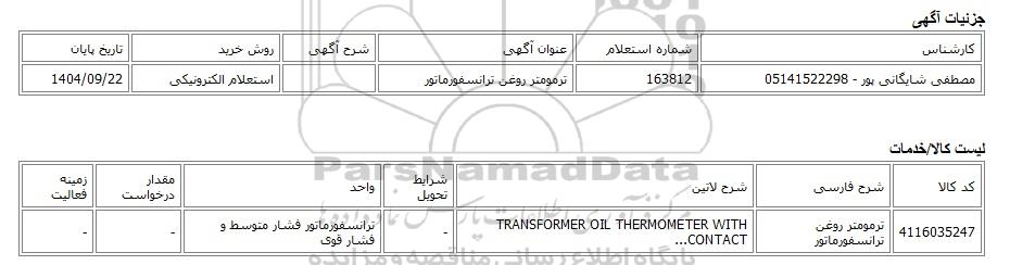 | مصطفی شایگانی پور - 05141522298 | 163812 | ترمومتر روغن ترانسفورماتور | استعلام الکترونیکی | 1404/09/22 |