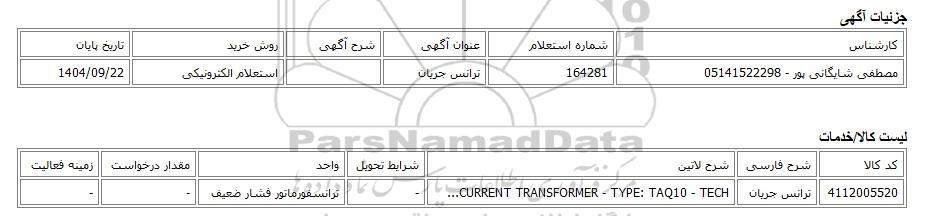 مصطفی شایگانی پور - 05141522298164281ترانس جریاناستعلام الکترونیکی1404/09/22
