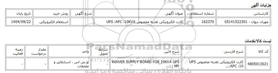 | مهران دیوان - 05141522301 | 162370 | کارت الکترونیکی تغذیه مخصوص UPS :APC :10KVA | استعلام الکترونیکی | 1404/09/22 |