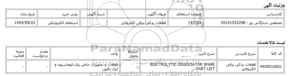 | مصطفی شایگانی پور - 05141522298 | 143722 | قطعات یدکی برقی الکترولایزر | استعلام الکترونیکی | 1404/09/22 |