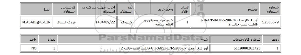 52505579آژیر 3 فاز مدل IRANSIREN-S200-3P با قابلیت نصب حالت 21خرید مواد مصرفی و اقلام عمومیکشوری1404/09/22مزدک اسدیM.ASADI@KSC.IR