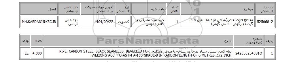 | 52506812 | مقاطع فلزی خاص(شامل لوله ها - میل های گرد،چهارگوش - شش گوش) | 1 | خرید مواد مصرفی و اقلام عمومی | کشوری | 1404/09/22 | محمد علی کردانی | MH.KARDANI@KSC.IR |