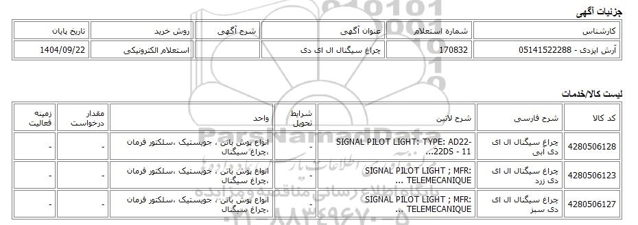 | آرش ایزدی - 05141522288 | 170832 | چراغ سیگنال ال ای دی | استعلام الکترونیکی | 1404/09/22 |