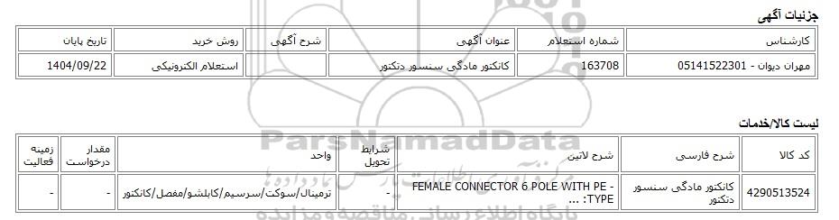 مهران دیوان - 05141522301163708کانکتور مادگی سنسور دتکتوراستعلام الکترونیکی1404/09/22