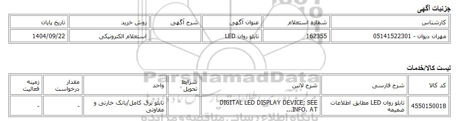 | مهران دیوان - 05141522301 | 162355 | تابلو روان LED | استعلام الکترونیکی | 1404/09/22 |