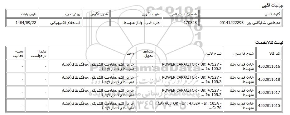 مصطفی شایگانی پور - 05141522298170828خازن قدرت ولتاژ متوسطاستعلام الکترونیکی1404/09/22