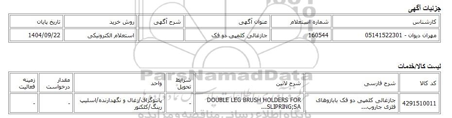 | مهران دیوان - 05141522301 | 160544 | جازغالی کلمپی دو فک | استعلام الکترونیکی | 1404/09/22 |