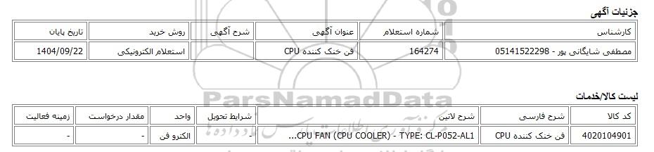 مصطفی شایگانی پور - 05141522298164274فن خنک کننده CPUاستعلام الکترونیکی1404/09/22
