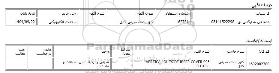 | مصطفی شایگانی پور - 05141522298 | 162731 | کاور اتصال سینی کابل | استعلام الکترونیکی | 1404/09/22 |