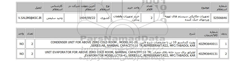 | 2 | 4DZM3640131 | اواپراتور برای سرد خانه بالای صفری, UNIT EVAPORATOR FOR ABOVE ZERO COLD ROOM, NAMINAL CAPACITY:10 TR, EVAPORATOR MODEL:LC7(6-4), SERIES:LC, REFRIGERANT:R22, MFC:TABADOL KAR, | 2 | NO |