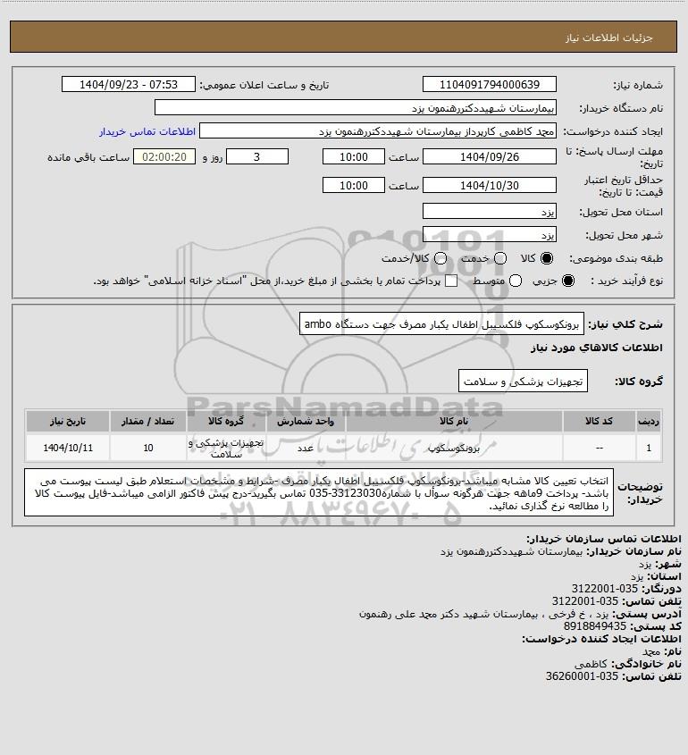 | 1 | -- | برونکوسکوپ | عدد | تجهیزات پزشکی و سلامت | 10 | 1404/10/11 |