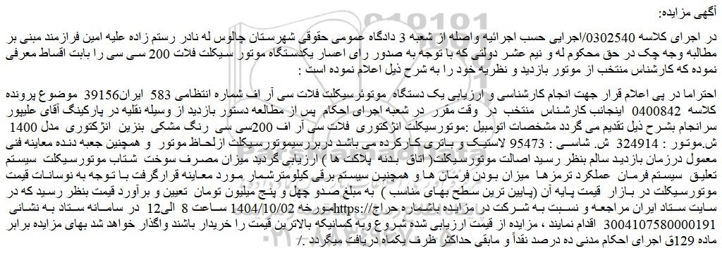 احتراما در پی اعلام قرار جهت انجام کارشناسی و ارزیابی یک دستگاه موتورسیکلت فلات سی آر اف شماره انتظامی 583 ایران39156 موضوع پرونده کلاسه 0400842 اینجانب کارشناس منتخب در وقت مقرر در شعبه اجرای احکام پس از مطالعه دستور بازدید از وسیله نقلیه در پارکینگ آقای علیپور سرانجام بشرح ذیل تقدیم می گردد مشخصات اتومبیل :موتورسیکلت انژکتوری فلات سی آر اف 200سی سی رنگ مشکی بنزین انژکتوری مدل 1400 ش.موتور : 324914 ش. شاسی : 95473 لاستیک و باتری کارکرده می باشد دربررسیموتورسیکلت ازلحاظ موتور و همچنین جعبه دنده معاینه فنی معمول درزمان بازدید سالم بنظر رسید اصالت موتورسیکلت( اتاق بدنه پلاکت ها ) ارزیابی گردید میزان مصرف سوخت شتاب موتورسیکلت سیستم تعلیق سیستم فرمان عملکرد ترمزها میزان بودن فرمان ها و همچنین سیستم برقی کیلومترشمار مورد معاینه قرارگرفت با توجه به نوسانات قیمت موتورسیکلت در بازار قیمت پایه آن (پایین ترین سطح بهای مناسب ) به مبلغ صدو چهل و پنج میلیون تومان تعیین و برآورد قیمت بنظر رسید که در مورخه 1404/10/02 ساعت 8 الی12 در سامانه ستاد به نشانی سایت ستاد ایران مراجعه و نسبت به شرکت در مزایده باشماره حراج 3004107580000191 اقدام نمایند ، مزایده از قیمت ارزیابی شده شروع وبه کسانیکه بالاترین قیمت را خریدار باشند واگذار خواهد شد بهای مزایده برابر ماده 129ق اجرای احکام مدنی ده درصد نقداً و مابقی حداکثر ظرف یکماه دریافت میگردد ./