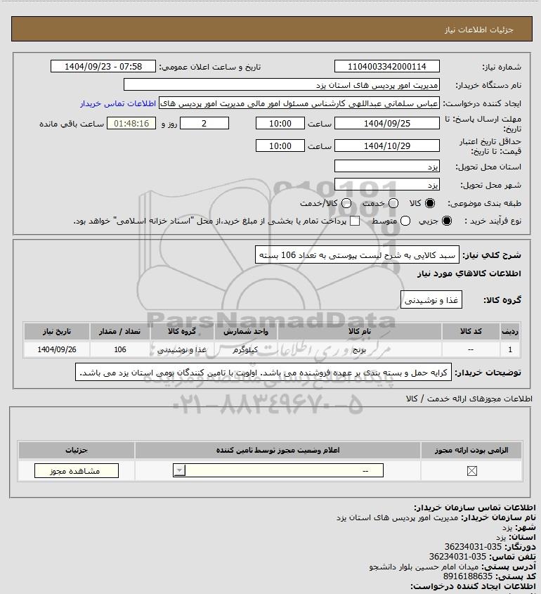 شرح کلی نیاز: سبد کالایی به شرح لیست پیوستی به تعداد 106 بسته