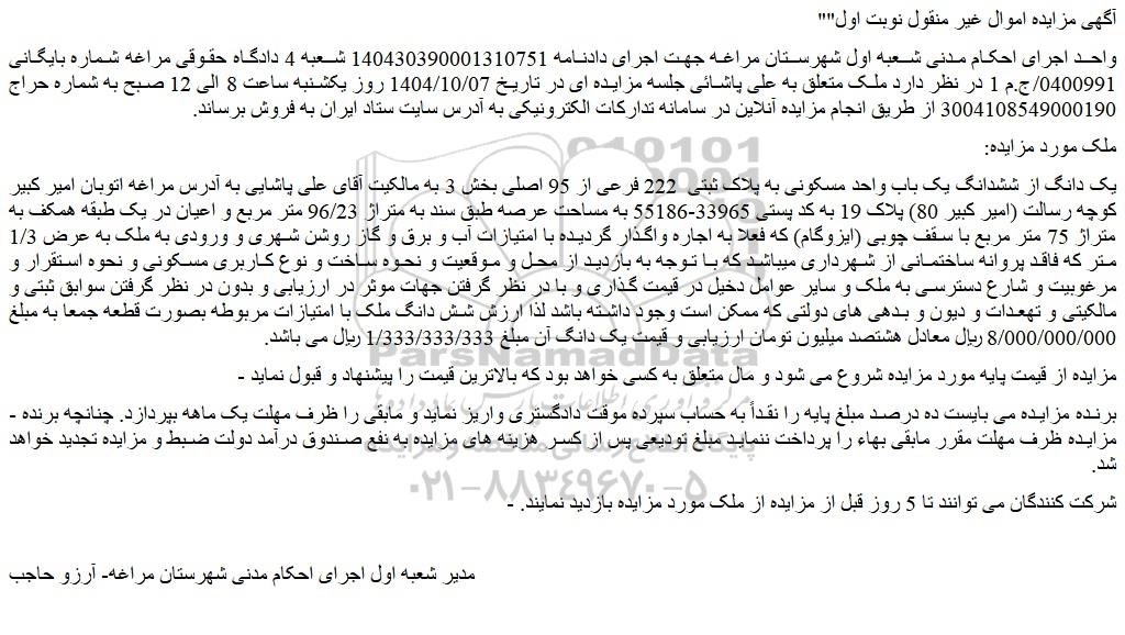 واحد اجرای احکام مدنی شعبه اول شهرستان مراغه جهت اجرای دادنامه 140430390001310751 شعبه 4 دادگاه حقوقی مراغه شماره بایگانی 0400991/ج.م 1 در نظر دارد ملک متعلق به علی پاشائی جلسه مزایده ای در تاریخ 1404/10/07 روز یکشنبه ساعت 8 الی 12 صبح به شماره حراج 3004108549000190 از طریق انجام مزایده آنلاین در سامانه تدارکات الکترونیکی به آدرس سایت ستاد ایران به فروش برساند.