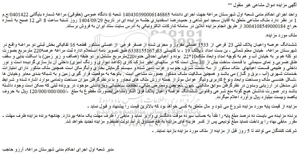 واحد اجرای احکام مدنی شعبه اول شهرستان مراغه جهت اجرای دادنامه 140430390006146865 شعبه 6 دادگاه عمومی (حقوقی) مراغه شماره بایگانی 0401422/ج.م 1 در نظر دارد ملک مشاعی متعلق به آقایان سعید امیرشاهی و حمیدرضا اسفندیاری جلسه مزایده ای در تاریخ 1404/09/29 روز شنبه ساعت 8 الی 12 صبح به شماره حراج 3004108549000184 از طریق انجام مزایده آنلاین در سامانه تدارکات الکترونیکی به آدرس سایت ستاد ایران به فروش برساند.