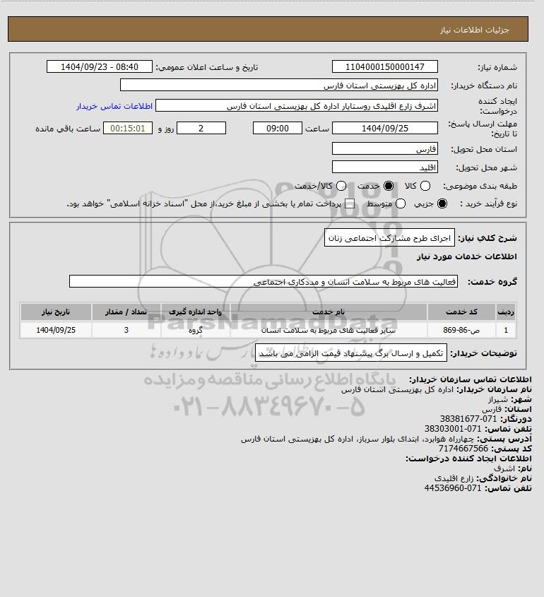 استعلام بها و موضوع استعلام استعلام اجرای طرح مشارکت اجتماعی زنان به اطلاع کلیه شرکتها و افراد متخصص واجد شرایط میرساند، آگهی گذار در نظر دارد از طریق استعلام بها، نسبت به انتخاب و دریافت پیشنهادات اقدام نماید. این استعلام با کد آگهی ثبت شده در سامانه خبرگزاری پارس نماد : 9991407 منتشر شده است. مشخصات استعلام : تاریخ شروع استعلام: 1404/09/23 آخرین مهلت ارسال پیشنهاد قیمت : 1404/09/25 و محل اجرای پروژه : استان فارس میباشد. استعلام قیمت مورد درخواست : استعلام اجرای طرح مشارکت اجتماعی زنان با دستهبندیهای تخصصی و گروه های مرتبط : خدمات و تجهیزات آزمایشگاهی و پزشکی, استعلام اطلاع رسانی میگردد.