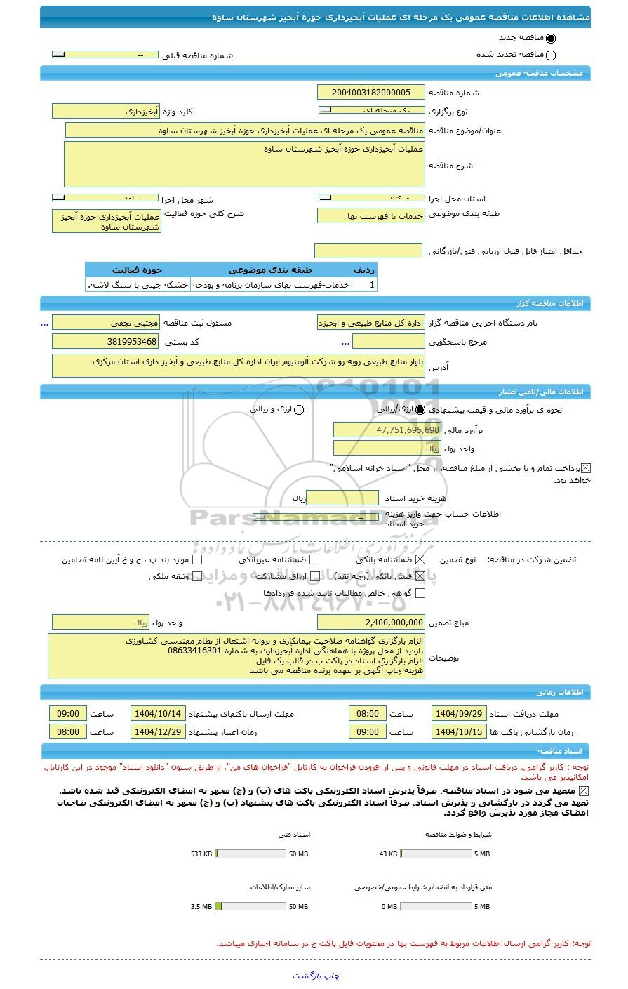 عنوان/موضوع مناقصهمناقصه عمومی یک مرحله ای عملیات آبخیزداری حوزه آبخیز شهرستان ساوه