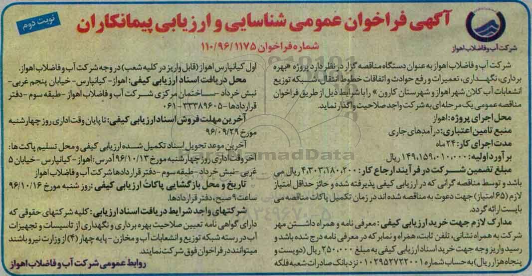 فراخوان ارزیابی بهره برداری، نگهداری، تعمیرات و رفع حوادث و انشعابات آب ...- نوبت دوم, مناقصه عمومی, فراخوان ارزیابی بهره برداری، نگهداری، تعمیرات و رفع حوادث و انشعابات آب ...- نوبت دوم