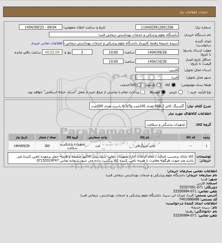 شرح کلی نیاز: گایدینگ کاتتر 3-6XB تعداد 100عدد و3/5-6 راست تعداد 200عدد