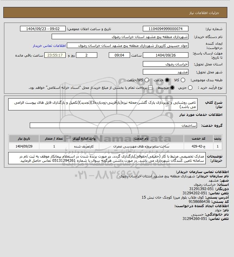 شرح کلی نیاز: تامین روشنایی و نورپردازی پارک گلشن-محله نیزه(بازآفرینی-زودبازده3)(تجدید)(تکمیل و بارگذاری فایل های پیوست الزامی می باشد)