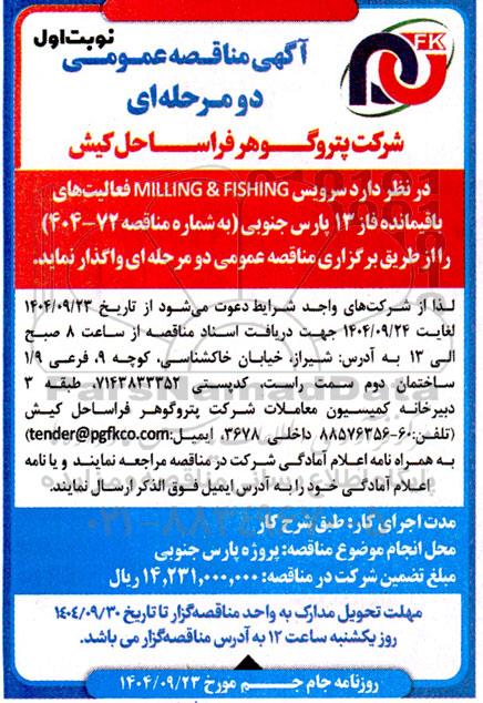 شرکت پتروگوهر فراساحل کیش در نظر دارد سرویس MILLING & FISHING فعالیت های باقیمانده فاز 13 پارس جنوبی (به شماره مناقصه 72- 404) را از طریق برگزاری مناقصه عمومی دو مرحله ای واگذار نماید