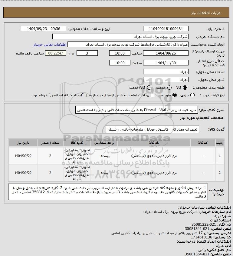 | 2 | -- | نرم افزار مدیریت مجوز (لایسنس) | بسته | تجهیزات مخابراتی، کامپیوتر، موبایل، ملزومات جانبی و شبکه | 2 | 1404/09/29 |