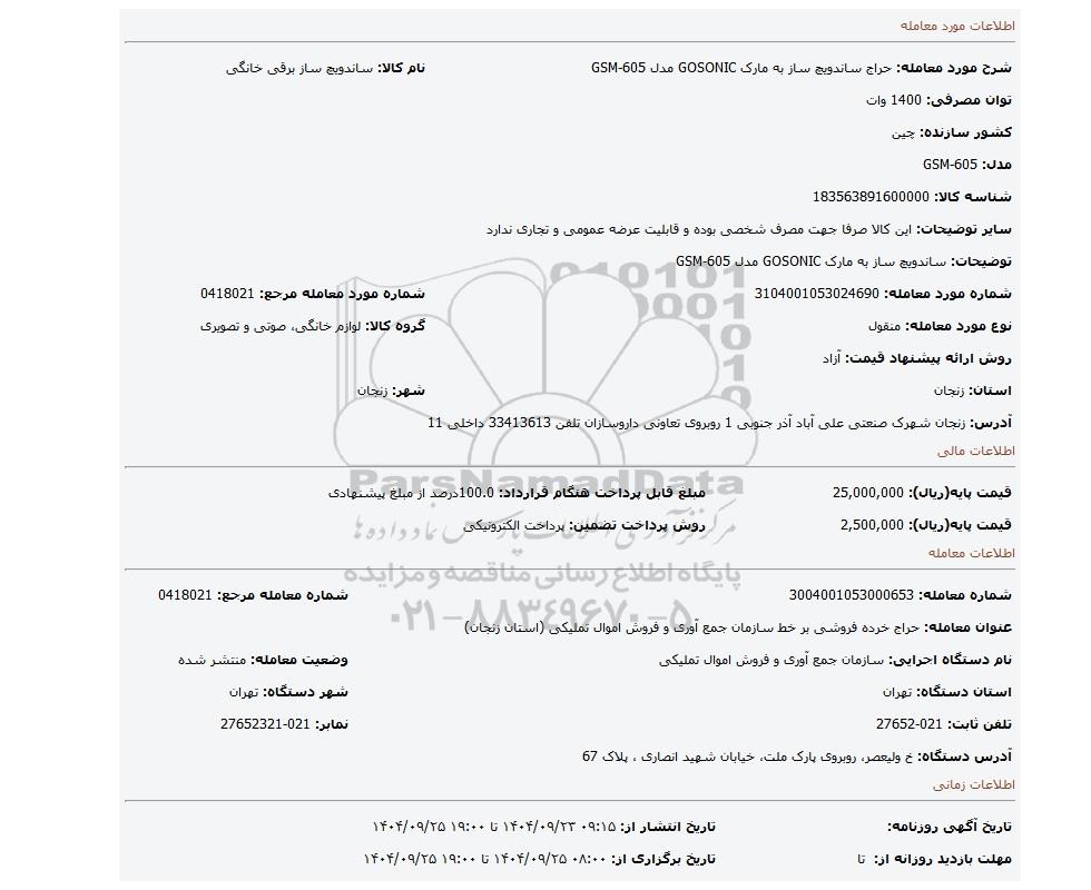 مزایده عمومی مزایده ساندویچ ساز به مارک GOSONIC مدل GSM-605 برگزار میگردد. از کلیه افراد متخصص و شرکتهای واجد شرایط دعوت به عمل میآید تا در این مزایده با کد خبرگزاری پارس نماد : 9992002 شرکت نمایند تاریخ شروع مزایده : 1404/09/23 مهلت شرکت در مزایده: تا پایان روز 1404/09/25 مکان برگزاری اموال واگذاری استانهای زنجان و دستهبندیهای مربوط به این حراجی متفرقه میباشد.