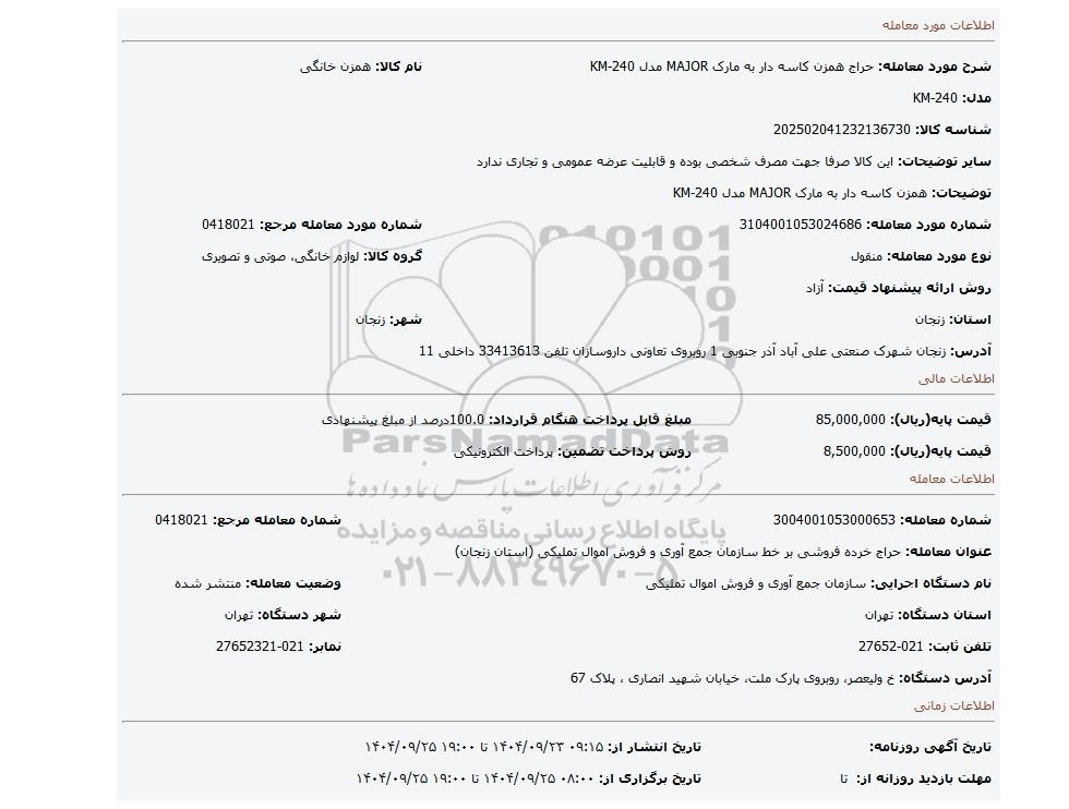 عنوان معامله: حراج خرده فروشی بر خط سازمان جمع آوری و فروش اموال تملیکی (استان زنجان)