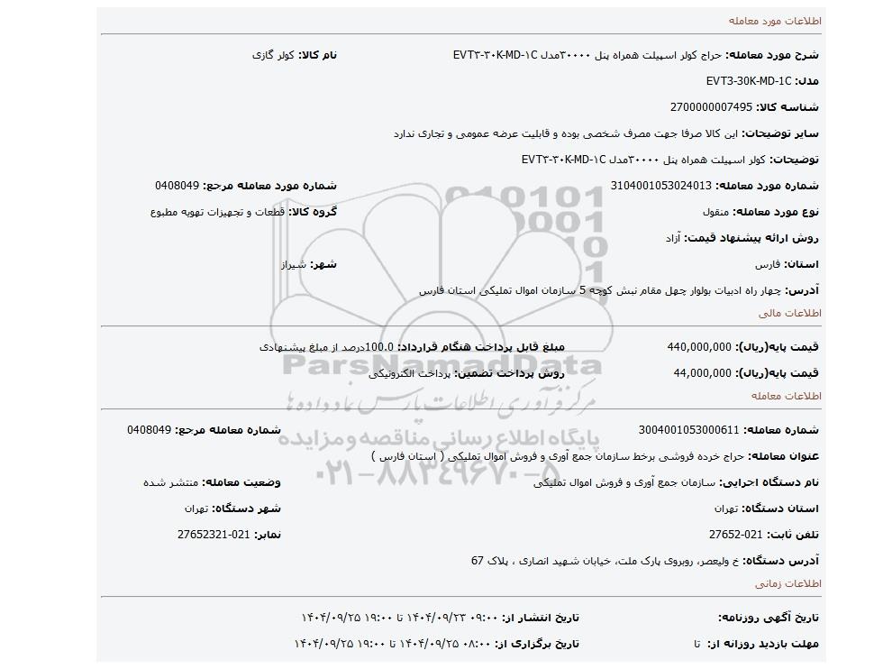 | شرح مورد معامله: حراج کولر اسپیلت همراه پنل ۳۰۰۰۰مدل EVT۳-۳۰K-MD-۱C | نام کالا: کولر گازی | |