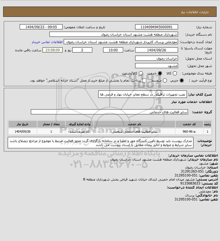 شرح کلی نیاز: نصب تجهیزات ترافیکی در سطح معابر خیابان بهار و فرعی ها