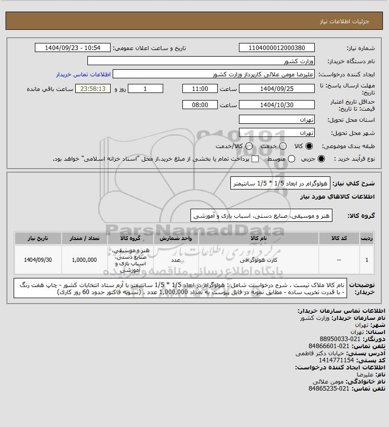 | 1 | -- | کارت هولوگرافی | عدد | هنر و موسیقی، صنایع دستی، اسباب بازی و آموزشی | 1,000,000 | 1404/09/30 |