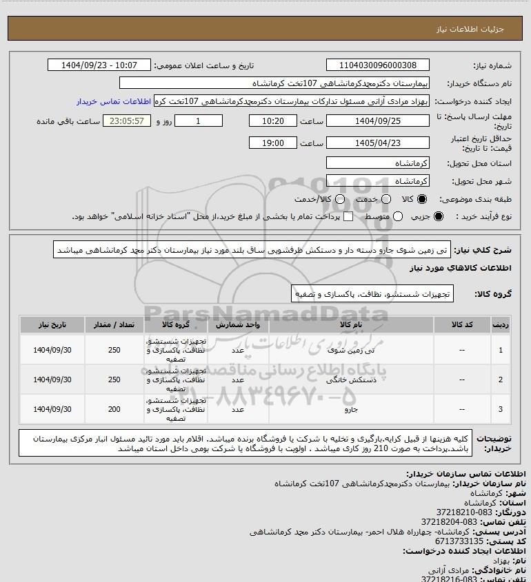 | 1 | -- | تی زمین شوی | عدد | تجهیزات شستشو، نظافت، پاکسازی و تصفیه | 250 | 1404/09/30 |