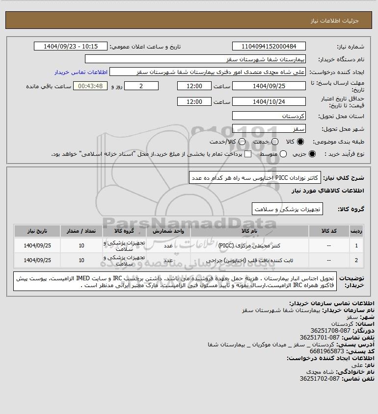 1 -- کتتر محیطی مرکزی (PICC) عدد تجهیزات پزشکی و سلامت 10 1404/09/25