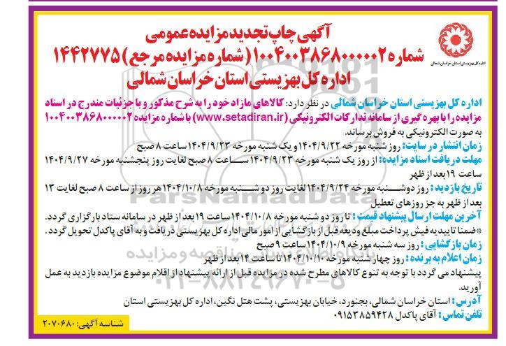 اداره کل بهزیستی استان خراسان شمالی در نظر دارد کالاهای مازاد خود را به شرح مذکور و با جزئیات مندرج در اسناد مزایده را با بهره گیری از سامانه تدارکات الکترونیکی (ستاد ایران) با شماره مزایده 1004003868000002 به صورت الکترونیکی به فروش برساند.