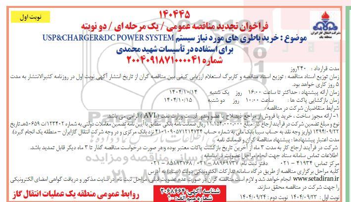 موضوع: خرید باطری های مورد نیاز سیستم USP&CHARGER&DC POWERSYSTEM برای استفاده در تأسیسات شهید محمدی
