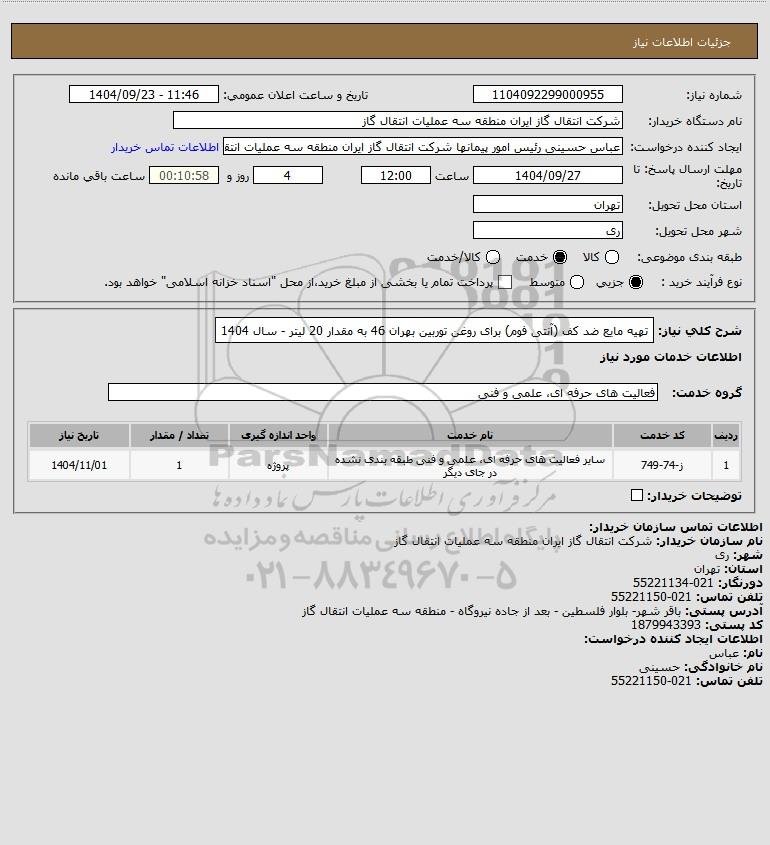 شرح کلی نیاز: تهیه مایع ضد کف (آنتی فوم) برای روغن توربین بهران 46 به مقدار 20 لیتر - سال 1404