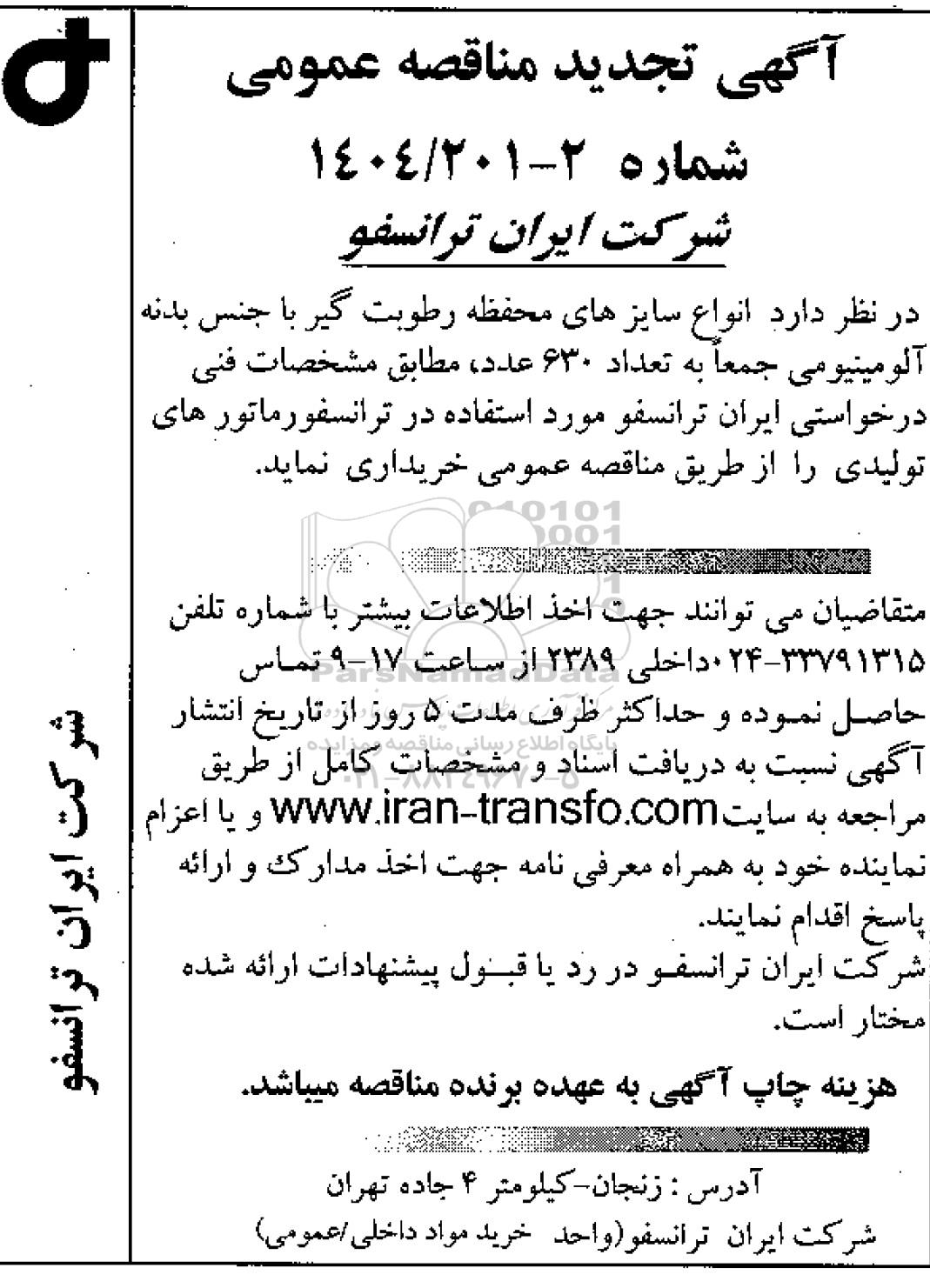 در نظر دارد انواع سایزهای محفظه رطوبت گیر با جنس بدنه آلومینیومی جمعا به تعداد 630 عدد، مطابق مشخصات فنی درخواستی ایران ترانسفو مورد استفاده در ترانسفورماتورهای تولیدی را از طریق مناقصه عمومی خریداری نماید.