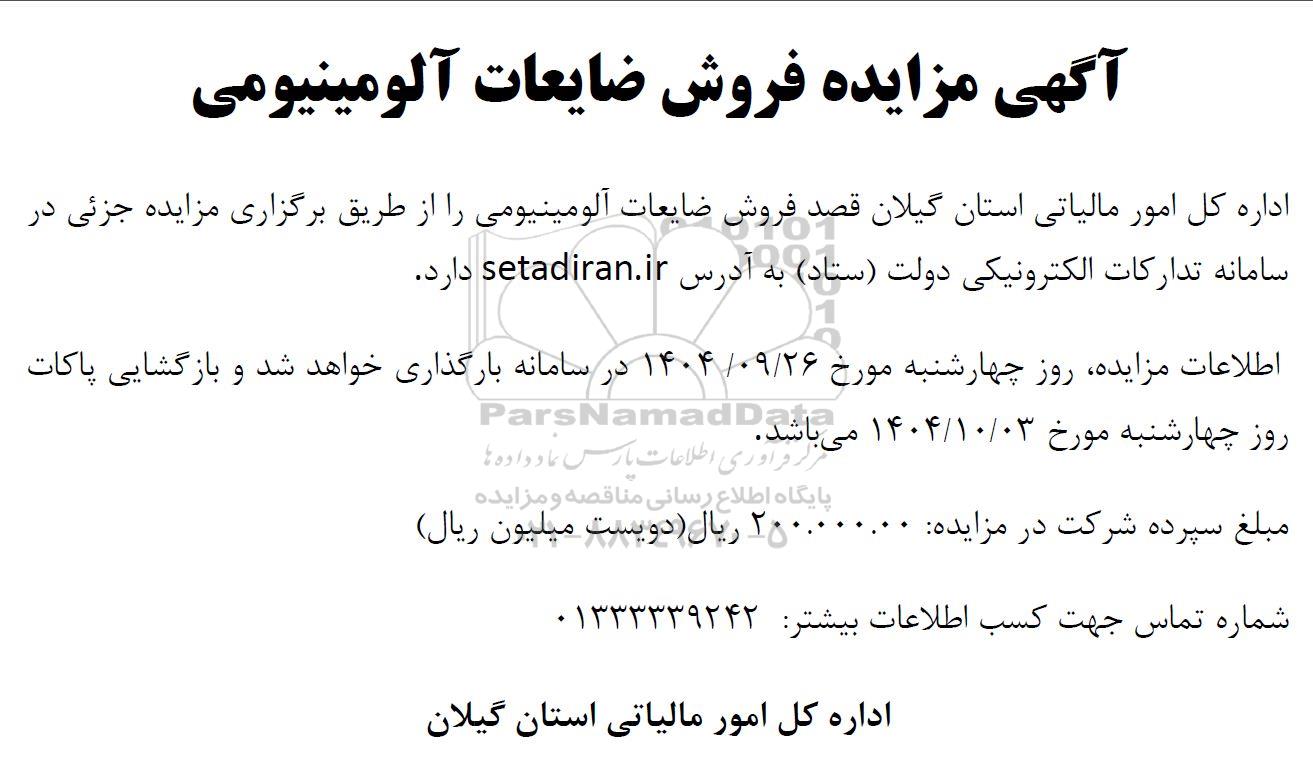 اداره کل امور مالیاتی استان گیلان قصد فروش ضایعات آلومینیومی را از طریق برگزاری مزایده جزیی در سامانه تدارکات الکترونیکی دولت (ستاد) ایران دارد . اطلاعات مزایده روز چهارشنبه مورخ 1404.09.26 در سامانه بارگذاری خواهد شد و بازگشایی پاکات روز چهارشنبه مورخ 1404.10.3 می باشد.