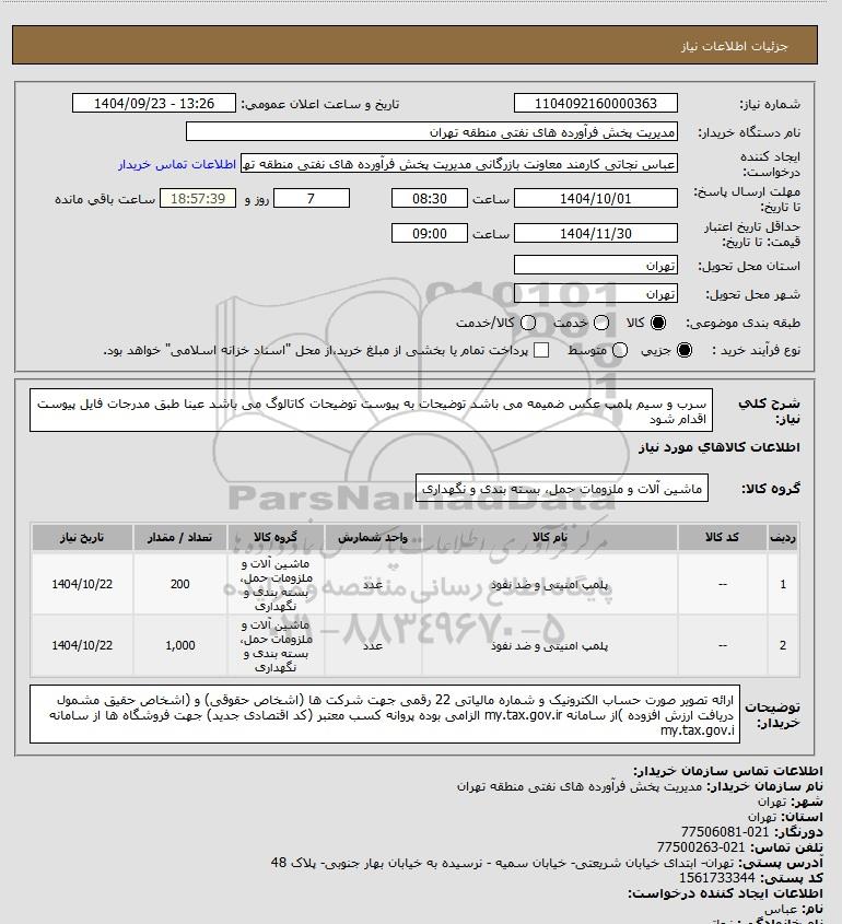 1 -- پلمپ امنیتی و ضد نفوذ عدد ماشین آلات و ملزومات حمل، بسته بندی و نگهداری 200 1404/10/22