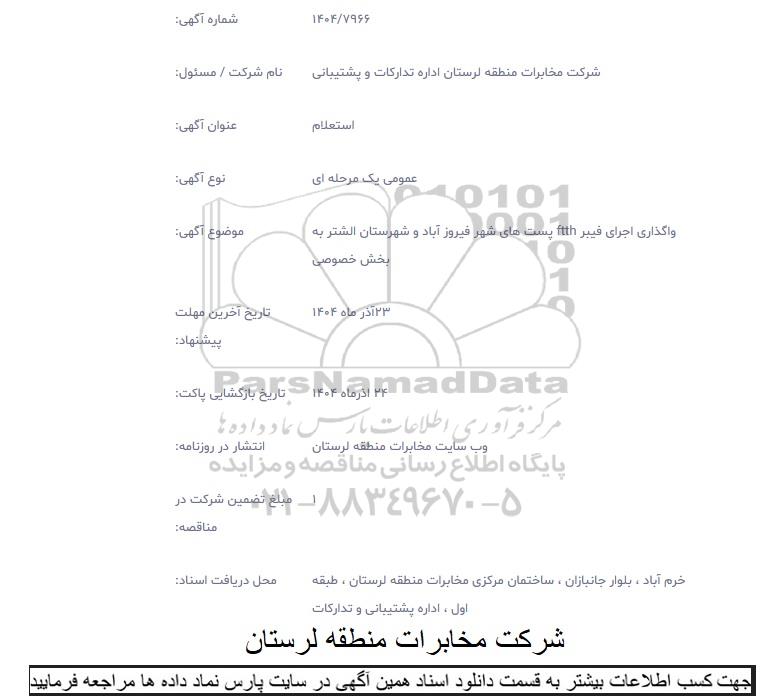موضوع آگهی: واگذاری اجرای فیبر FTTH پست های شهر فیروزآباد و شهرستان الشتر به بخش خصوصی