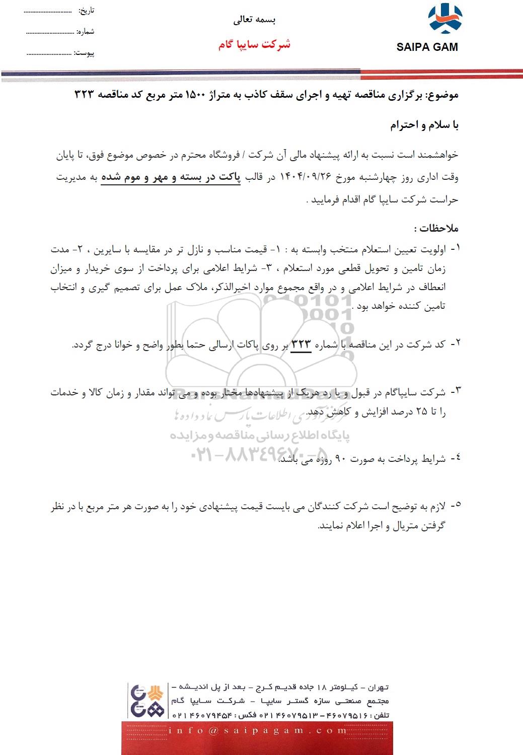 موضوع: برگزاری مناقصه تهیه و اجرای سقف کاذب به متراژ 1500 متر مربع کد مناقصه 323