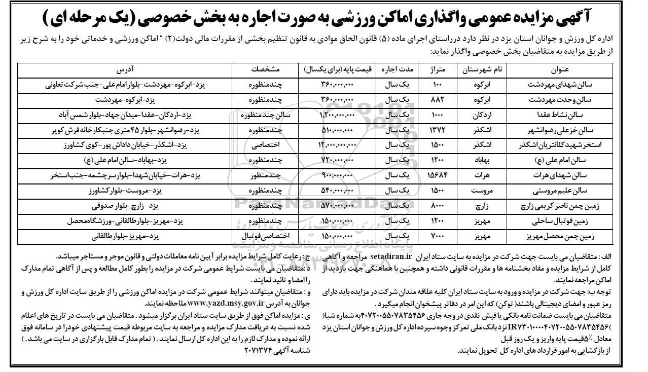 اداره کل ورزش و جوانان استان یزد در نظر دارد در راستای اجرای ماده (5) قانون الحاق موادی به قانون تنظیم بخشی از مقررات مالی دولت (2) اماکن ورزشی و خدماتی خود را به شرح زیر از طریق مزایده به متقاضیان بخش خصوصی واگذار نماید.