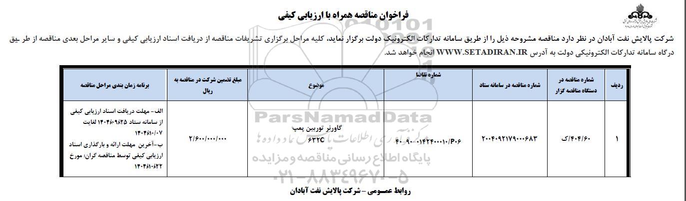 شرکت پالایش نفت آبادان در نظر دارد مناقصه مشروحه ذیل را از طریق سامانه تدارکات الکترونیک دولت برگزار نماید. کلیه مراحل برگزاری تشریفات مناقصه از دریافت اسناد ارزیابی کیفی و سایر مراحل بعدی مناقصه از طریق درگاه سامانه تدارکات الکترونیکی دولت به آدرس ستاد ایران انجام خواهد شد.