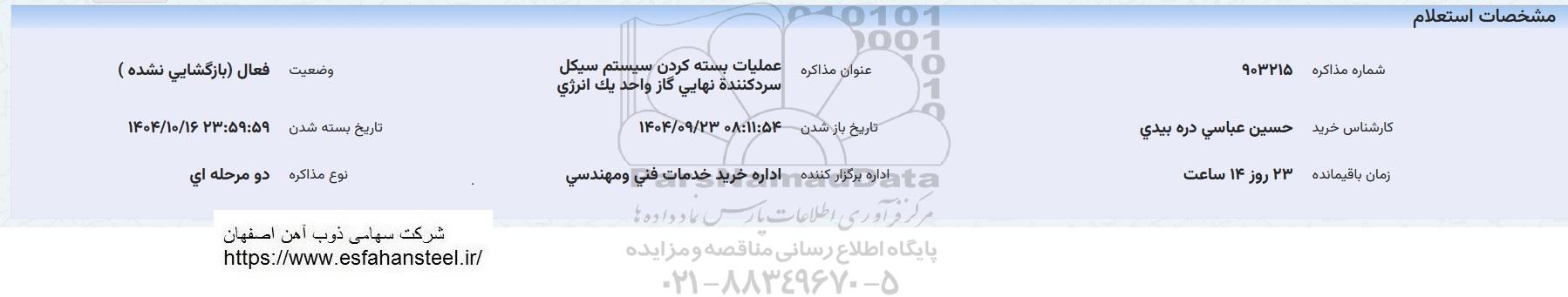 | شماره مذاکره 903215 | عنوان مذاکره: عملیات بسته کردن سیستم سیکل سرد کننده نهایی گاز واحد یک انرژی | وضعیت: فعال (بازگشایی نشده) |